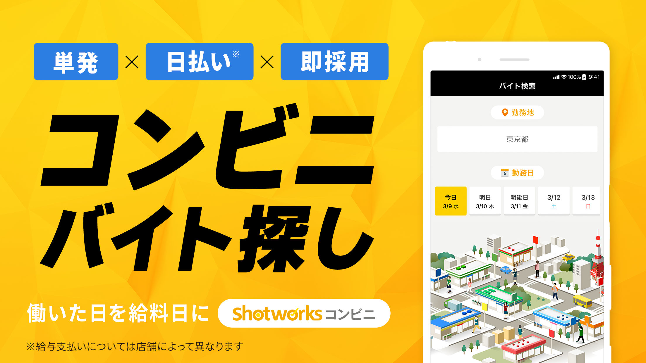 「ショットワークスコンビニ」は、あなたのコンビニ経験が今すぐお金に変わる、単発バイト探しアプリです!